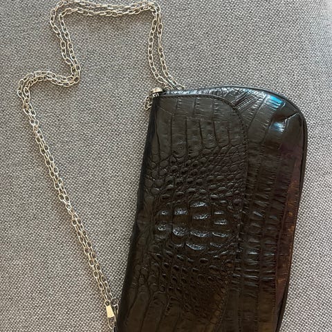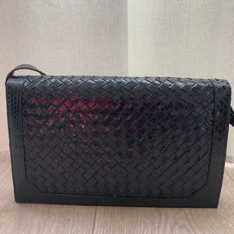 skulderveske for dame i svart kunstlær. Vesken har flettet struktur i materialet og lukkes med klaff. Den leveres med en tynn skulderreim i lenkestil. Passer til oppbevaring av mindre nødvendigheter som mobil, nøkler og lommebok ved hverdagsbruk eller enklere anledninger.
