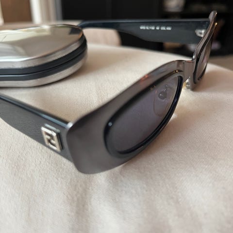 Gucci solbriller for dame i svart innfatning. Brillene har ovale glass med ca. 55 mm bredde og nesebro på ca. 18 mm, ifølge illustrasjonen. Innfatningen er i blank svart plast med metall-detaljer og Gucci-logo på stengene. Leveres med etui som vist på bildene. Egnet som solbriller til daglig bruk.