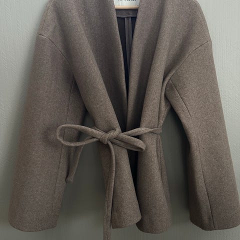 Jakken er beige og laget i ullmateriale. Den har bred krage, dobbeltspent lukking foran og sidelommer. På baksiden er det knytebelte i samme stoff som kan justeres for ønsket passform. Nøytral farge og klassisk snitt gjør at jakken kan brukes til ulike antrekk i hverdagen og til mer formelle anledninger.