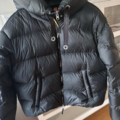 Parajumpers dunjakke for dame i størrelse L. Jakken er svart og fylt med dun for god isolasjon. Den har hette med pelskant og karakteristisk stroppdetalj ved halsen. Ytterjakken har glidelås i front og flere lommer. Passer som varm ytterjakke i kaldt vær. :)