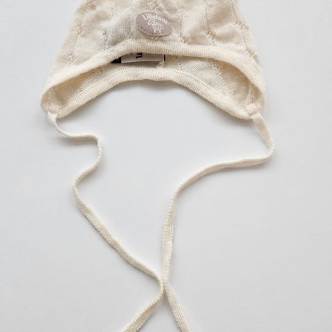 Lillelam babylue i størrelse 40/44, unisex. Luen er i hvit merinoull og har knyting under haken for å sitte godt på hodet. Egner seg til bruk for baby/nyfødt hele året, både inne og ute.