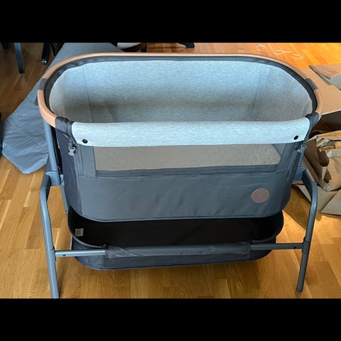 Røyk- og hundefritt hjem. Bedside crib som kan kobles på alle senger med medfølgende feste. Justeres i høyde og til sides etter behov. Kan også brukes som enkeltstående seng og vugge. Hjul på ene siden gjør det lett å flytte på sengen. Lett og pakke ned i medfølgende reisepose/bag. Tar liten plass i bil.