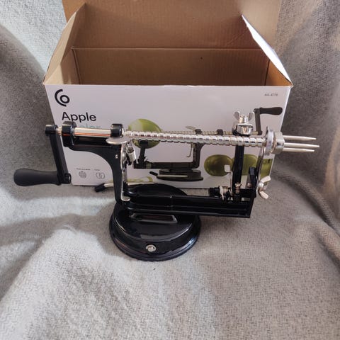 Anders Petter epleskreller kjøkkenutstyr. Manuell epleskreller som festes til bordkant med skrutvinge. Utstyrt med sveiv og kniv som skreller og skiver epler i én operasjon. Egnet til tilberedning av epler til matlaging og baking på kjøkkenet.