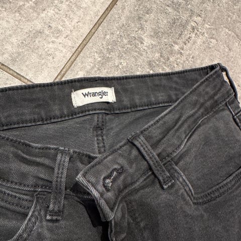 Wrangler bootcut jeans i blå denim for dame. Buksen har livvidde W28 og lengde L32 og passer størrelse M. Brukt én gang.