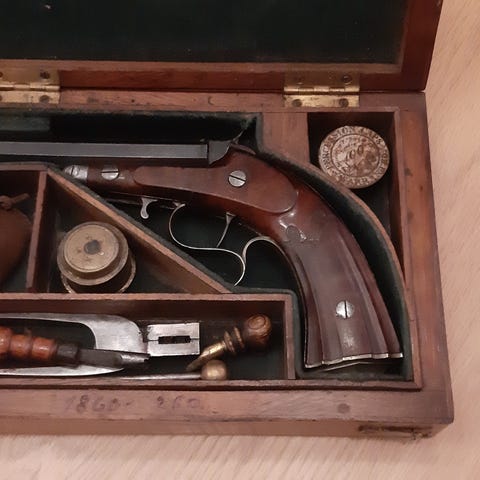 Flott og dekorativ perkusjonspistol. Opprinnelig har nok denne hatt flintlås, men har blitt konvertert til perkusjonslås, trolig på 1830 - 1840 - tallet. Fine detaljer på underbeslag, sideblikk, kolbekappe og tomskilt. Fremre rørken og ladestokk er ikke originale. Låsen fungerer fint, hanen henger seg bra opp i både hel- og halvspenn. Pistongen er i bra stand. Kaliber ca 13,7 mm. Pipelengde ca 26 cm. Totallengde ca 41 cm.