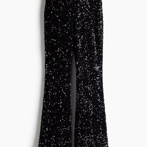 Camilla Pihl bukser for dame i størrelse L. Buksen er svart og dekket av paljetter. Den har lange ben og rett passform, egnet til bruk ved anledninger der man ønsker et mer pyntet uttrykk. Materialet består av paljetter som gir en glitrende overflate. Passer til ulike overdeler, som bluser, topper eller jakker, og kan kombineres med både høye hæler og flate sko.
