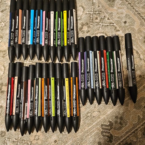 Sett med Promarker-tusjer i ulike farger, med dobbelt tupp (bred og smal). Tusjene er egnet for illustrasjon, tegning og skisser på papir. Kombinasjonen av akrylblokk og tusjer kan brukes til ulike kreative prosjekter som tegning, maling, illustrasjon og hobbyarbeid.