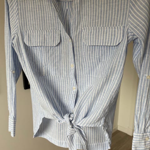 Nydelig blå og hvit kjole fra HM Save water kolleksjonen. Str 44. Kjolen er i lin / bomull. Sydd omslagskjole. Lengden fra skulder og ned er ca 105 cm.