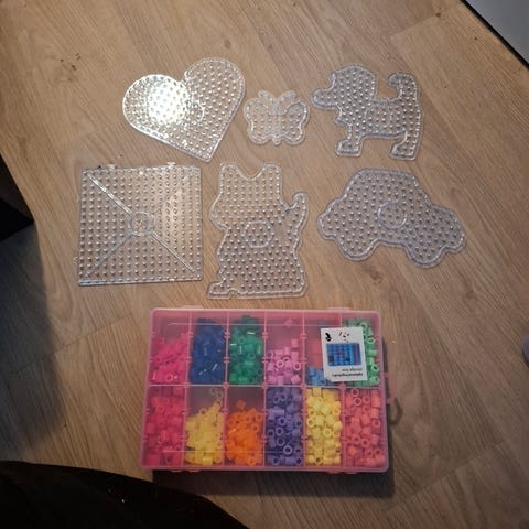 Forskjellige figurer, blant annet dinosaur, hjerte og sommerfugl. Noen store perler følger også med.