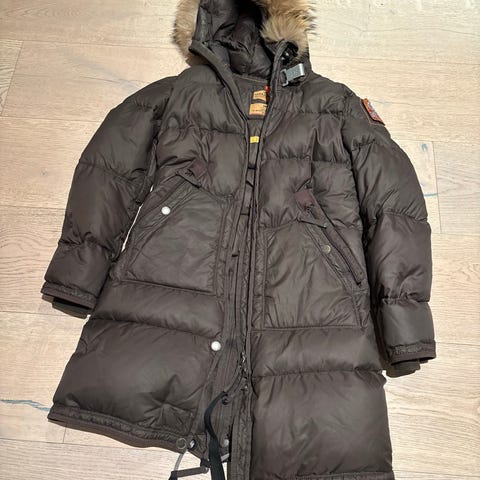 Parajumpers dunjakke for dame i størrelse S. Jakken er svart og fylt med dun, pels rundt kanten ikke inni hetta.