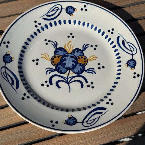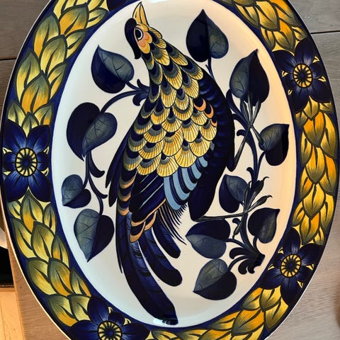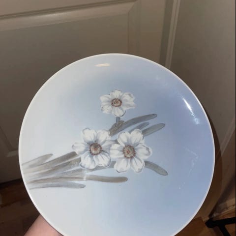 Selger dette fatet fra Royal Copenhagen. Det kan brukes både som fat, fruktfat vil jeg si. Det jan også stå til pynt. Det har også mulighet til å henges opp, slik jeg tolker to hull på baksiden. Det er 30cm i diameter. Det har ingen merker. Fremstår ubrukt. Hentes I Oslo, kan evnt sendes med posten. Kjøper betaler porto.