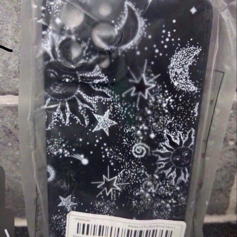 Apple iPhone 12 Pro Max telefondeksel i svart med hvitt stjerne-, sol- og månemotiv. Dekselet er tilpasset iPhone 12 Pro Max med 6,7-tommers skjerm og har utsparinger for kamera, knapper og porter. Egnet for daglig bruk som beskyttelse av baksiden og kantene på telefonen.