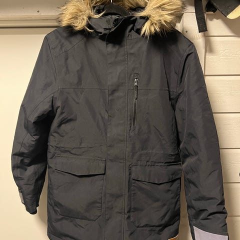 Tykk og god vinterjakke/parkas fra HM i str. 164. Avtagbar hette med «pels», praktiske lommer. Fargen er svart. Jeg kan sende.