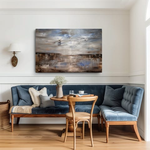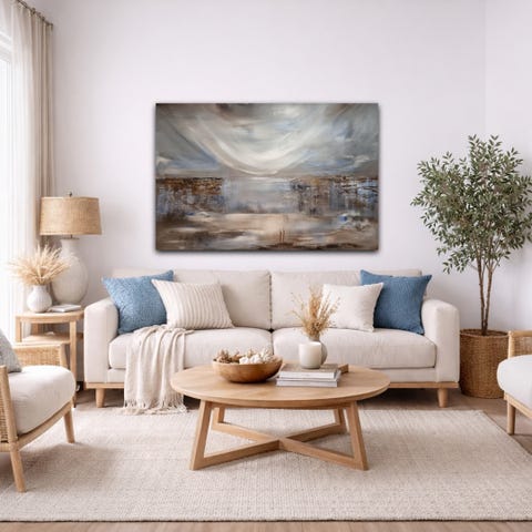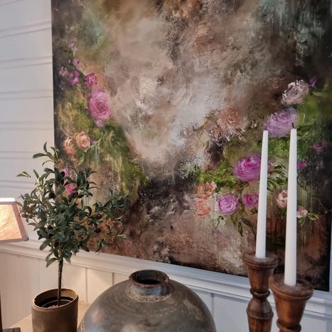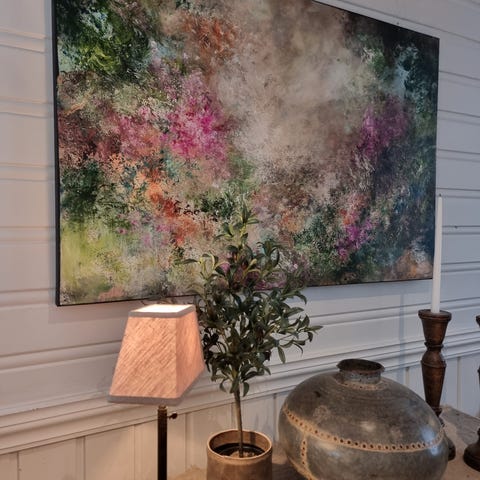 120×80cm stort maleri I nydelige velge,brune og blåtoner.