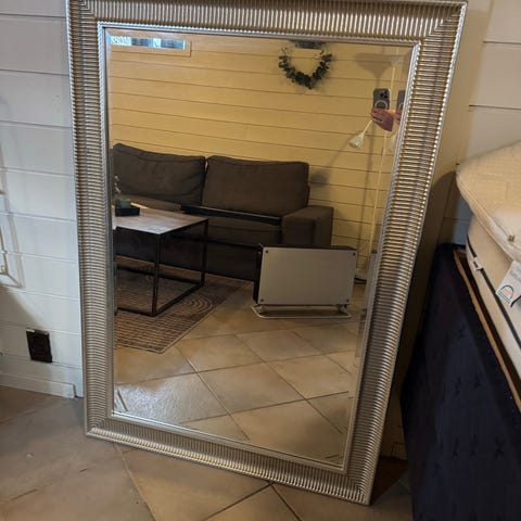 IKEA SONGE speil med rektangulær form. Speilet har en sølvfarget, profilert ramme i klassisk stil. Kan brukes som helfigurspeil i gang, soverom eller andre rom. Kan henges på vegg eller settes opp mot vegg etter behov, avhengig av opphengsløsning og plassering i rommet.