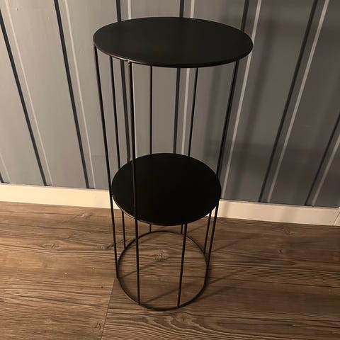 Pent brukt svart pidestall. Høyde: 70 cm. Bredde nede: 30 cm. Dybde nede: 30 cm. Den øverste hyllen måler 28x28 cm. Ingen synlige bruksmerker. Må hentes på Lade.