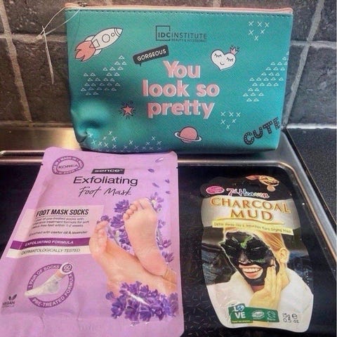 Sett med flere ansiktsmasker i ulike varianter, blant annet fuktighetsgivende og rensende masker i engangspakninger. I tillegg følger det med to par eksfolierende hansker i tekstil, ett par beige og ett par rosa, som kan brukes i dusjen sammen med såpe eller dusjgelé for å skrubbe og rense huden.