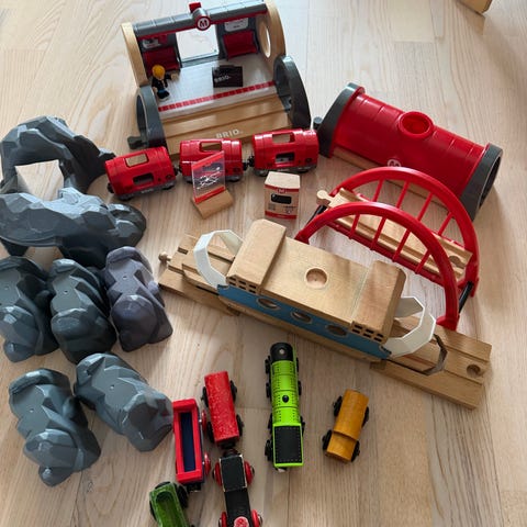 BRIO Tog Bondegård er et tretog med et lokomotiv og to vogner hvor bonden kan transportere dyrene sine. Ved å felle ned rampen kan hesten og kuen komme seg ombord i hver sin togvogn for videre transport på din BRIO togbane.