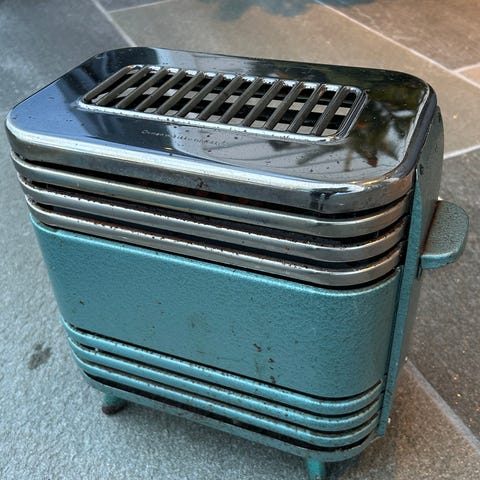 Vintage Elektrisk varmeovn i grønnlakkert metall med kromfargede detaljer. Ovnen har toppgitter for luftutslipp, bærehåndtak på siden og små føtter som løfter den fra gulvet. Strømtilkobling skjer via ledning med støpsel.