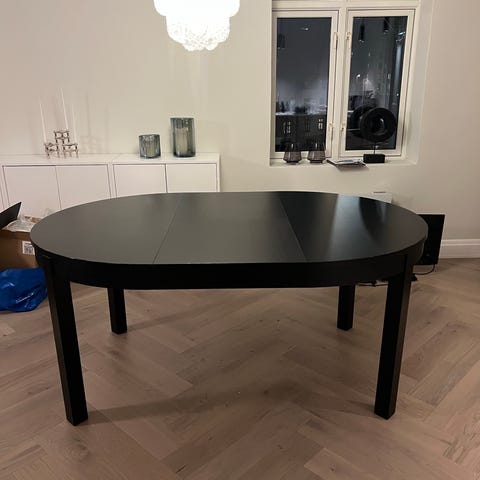 Ø115cm. Følger med 3 illeggsplater. 50cm hver ileggsplate. Bord fullt utslått blir 265cm.