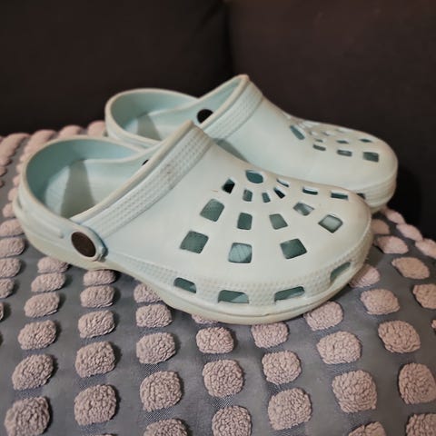 Pent brukte tøfler, Crocs like, cirka 18 cm inne