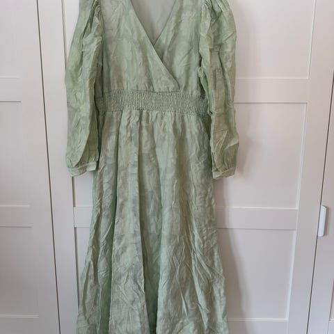 Careless kjole for dame i størrelse XL. Kjolen er lilla og knelang. Modellen har omslagseffekt i overdelen, korte puffede ermer med strikk ved ermavslutning og bred smockstrikk i midjen for bedre passform. Skjørtet er lett utsvingt. Stoffet har en diskret struktur som gir et mønstret uttrykk. Brukt 2 ganger.
