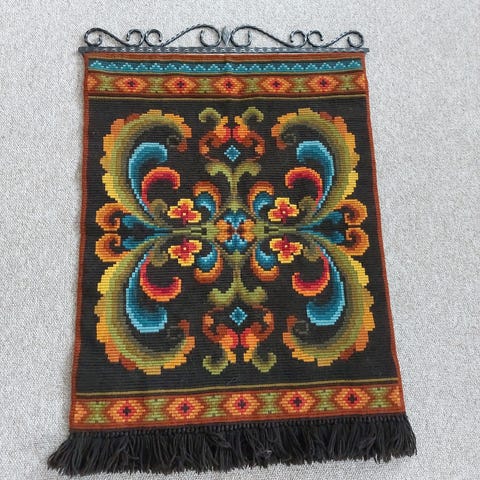 75 cm høyt med beslag og frynser og 47 cm bredt