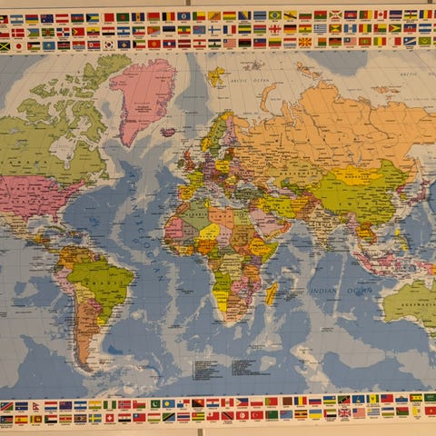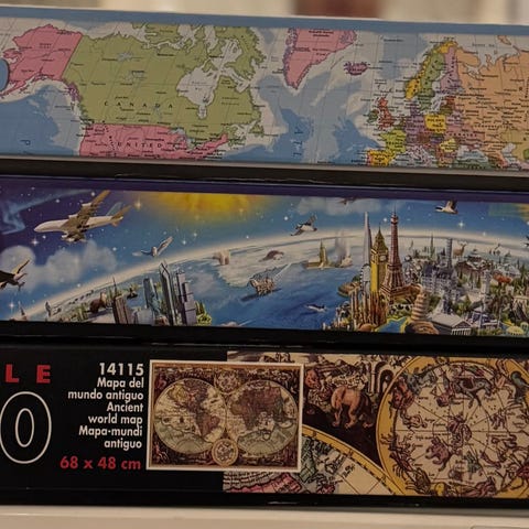 The World puslespill med 1000 brikker med motiv av et verdenskart i gammeldags stil. Ferdig puslet viser puslespillet et detaljert kart over verden med to store verdenskart-sirkler og dekorative illustrasjoner rundt. Egner seg som aktivitet for én eller flere personer og kan eventuelt limes og brukes som veggdekor etter at det er ferdig puslet.