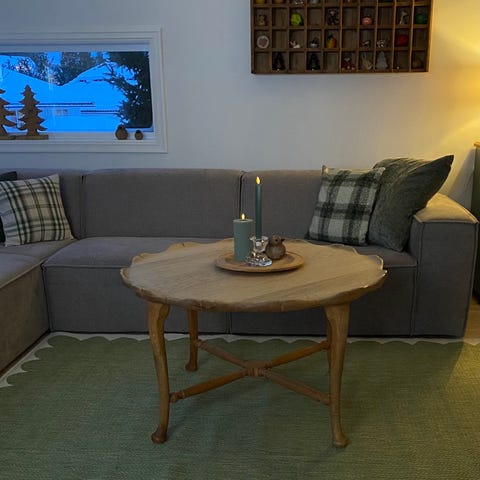 Krogenæs salong/sofabord. Bordplaten og noe av understellet er malt i fargen dempet sort. Står på en hytte på Faratangen 1622 Gressvik