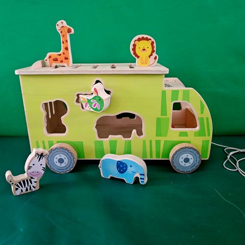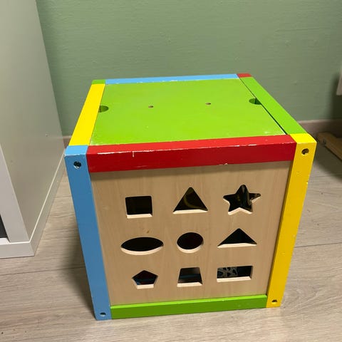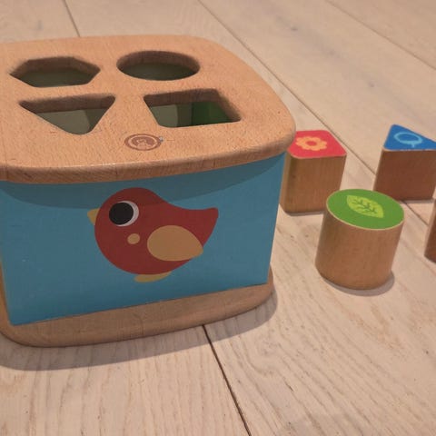 Huset har utskårne former på sidene og avtagbart lokk med ulike hull til klossene. Settet inkluderer flere geometriske klosser i tre som passer i de tilhørende formene. Leketøyet er laget i tre med glatt overflate og avrundede kanter. Egnet som aktivitetsleke for små barn til formgjenkjenning, fargegjenkjenning og finmotorisk trening.