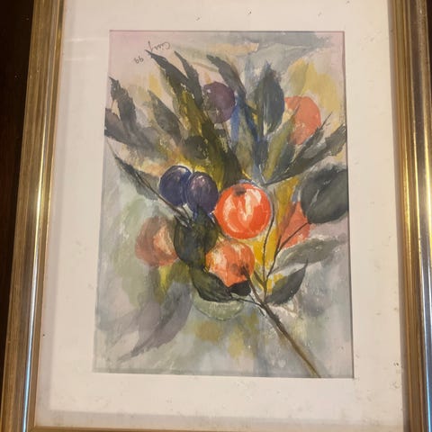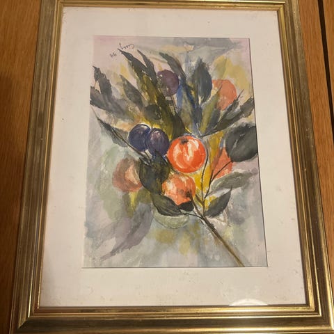 Landskapsmaleri i akvarell . Motivet viser et grønt landskap med trær, gjerde og busker mot lys himmel. Bildet er innrammet med passepartout. Signatur nederst på motivet.