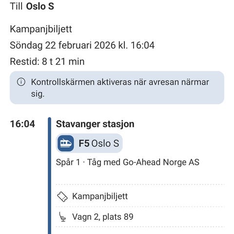 Togbillett 21. feb / Åndalsnes–Oslo S via Dombås