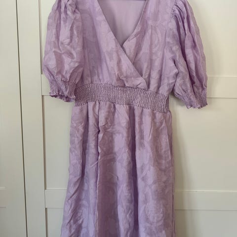 Careless sommerkjole i størrelse XL. Kjolen er laget i polyester og har et flerfarget blomstermønster med hovedfarge i lilla. Modellen har V-utringning, lange ermer og knappelukking foran. Skjørtet er rynket i livet for en løs og komfortabel passform. Egnet som sommerkjole eller hverdagskjole. Brukt et par ganger.