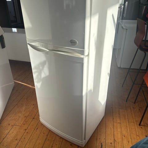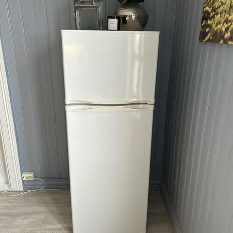 Kjøleskapet har overdel med fryser og underdel med kjøledel. Innvendig finnes hyller i kjøledelen og en separat frysedel med hylle.