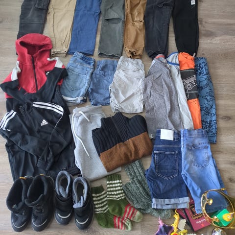 Klespakke str 122/128. Det er to plagg i str 116, men de er brukt samtidig som resten. Bruksmerker kan forekomme.