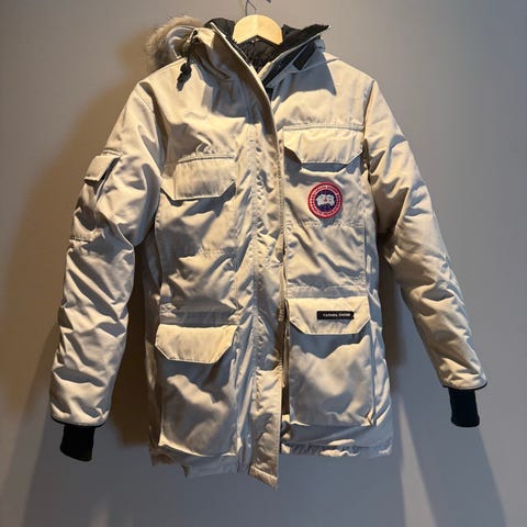 Canada Goose Expedition parkasjakke for dame i størrelse XS. Jakken er beige og har hette med pelskant, flere utvendige lommer med klaff og Canada Goose Arctic Program-logo på ermet. Modellen er en lang parkas som gir god dekning og isolasjon, egnet som yttertøy i kaldt vær.