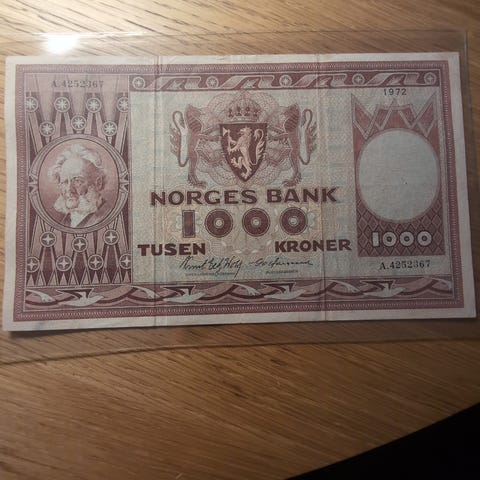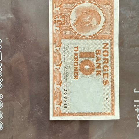 Norges Bank 10 kroner seddel fra 1970. Forsiden viser portrett, valør og pålydende tekst «TI KRONER», samt serienummer. Baksiden har motiv med skip og figur, samt valørangivelse. Seddelen kan egne seg for samlere av norske pengesedler og numismatikk.