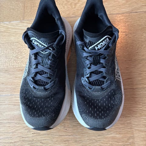 Hoka One One Clifton 6 løpesko i størrelse 45 1/3(EU). Modellen er en nøytral løpesko med karakteristisk tykk mellomsåle. Skoene er i svart med hvit såle.