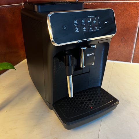 Philips kaffemaskin med integrert melkebeholder og bønnekvern. Frontpanel med display og berøringsknapper for valg av ulike kaffedrikker. Melkebeholderen kan tas av for påfylling og rengjøring. Kan trenge en avkalking, ellers i fin stand.