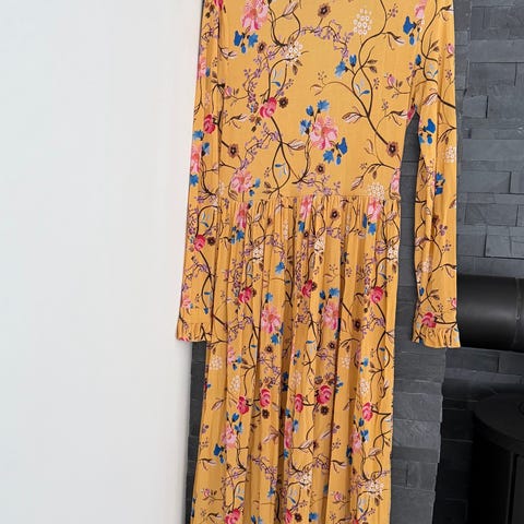 Stine Goya hverdagskjole for dame i størrelse M. Kjolen er flerfarget med blomstrete mønster og har lange ermer. Den er laget i viskose, som gir et lett og mykt fall. Modellen har knelengde til legg- eller ankellengde avhengig av høyde, og kommer med knytebelte i livet. Passer som hverdagskjole og kan brukes både til jobb og fritid.