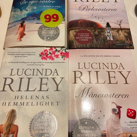 Bokpakke med romaner av Lucinda Riley og Colleen Hoover. Pakken inneholder blant annet «The Seven Sisters» og «Månesøsteren» av Lucinda Riley, samt «It Ends With Us» og «It Starts With Us» av Colleen Hoover. Bøkene er i pocketutgave.