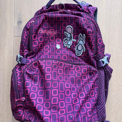 Beckmann skolesekk i lilla med mønstret tekstil og turkise detaljer. Sekken har flere rom med glidelås, inkludert frontlomme og sidelommer. Polstret rygg og skulderstropper med brystreim og hoftereim gir bedre bærekomfort. Egnet som skolesekk til barn, med god plass til bøker, matboks og annet skoleutstyr.