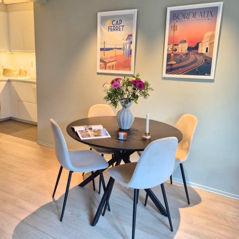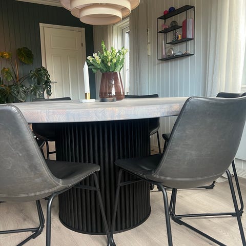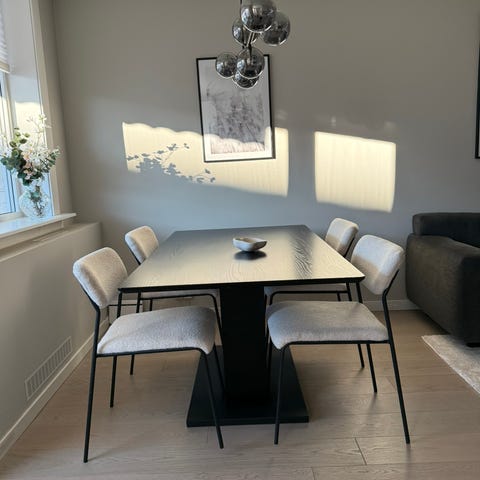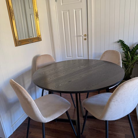 Spisebord, 4 spisestoler og teppe. De er kjøpt på Jysk. Ønsker å selge samlet til 2700kr