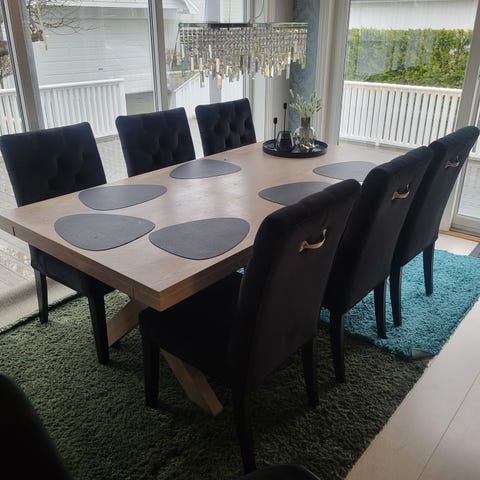 Stolene har et mykt, organisk design med dekorativ åpning i ryggen – både komfortable og et flott blikkfang rundt spisebordet.