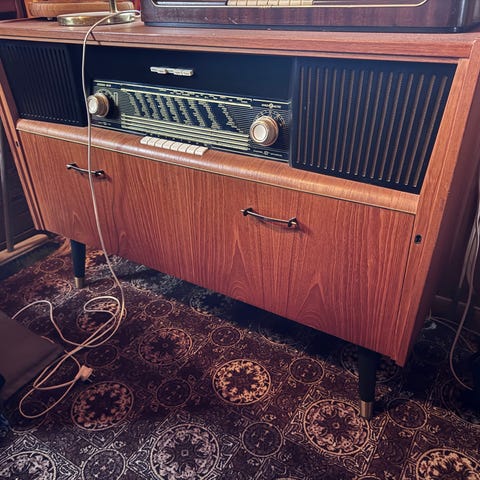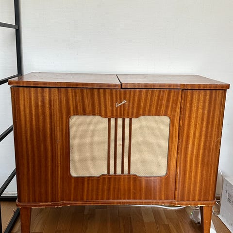 Radionett kabinett fra 1950-tallet. Radio med M, L og K-bølge, 45 og 78 platespiller fungerer. Litt skraper i lakkert topplate. 78-plate med Edith Piaf medfølger.