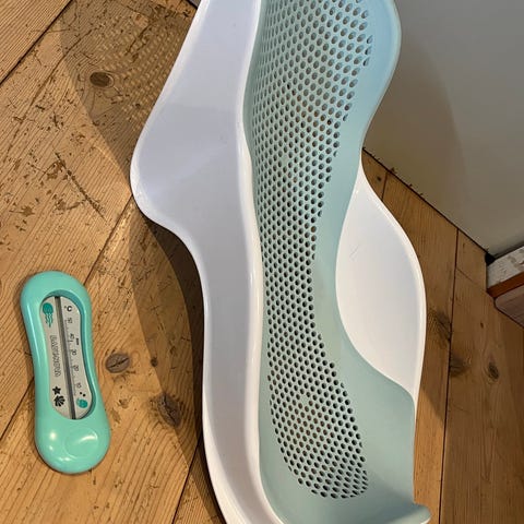 Baby badekar i hvit plast. Badekaret har avrundede kanter og enkel, avlang form som gir god plass til barnet. Innvendig er det sklisikre felt i bunnen for bedre stabilitet under bading. Egner seg til bruk på badegulv eller annen stabil overflate ved bading av baby og småbarn.