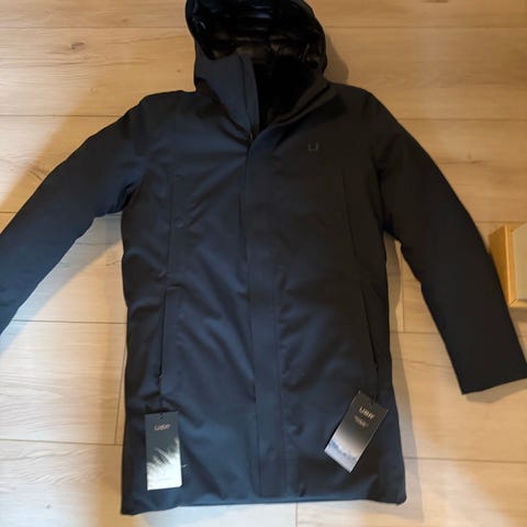 Ubr vinterjakke for herre i størrelse M. Jakken er blå og har hette. Modellen er en lengre vinterjakke som går godt ned over hoftene. Den har glidelås i front og flere innerlommer, blant annet en vertikal brystlomme med glidelås på innsiden. Ytterstoffet er glatt og beregnet for bruk i kaldt vær. Passer til hverdagsbruk og pendling i vinterhalvåret.