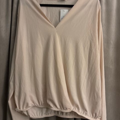 Gina Tricot bluse for dame i størrelse S. Blusen er laget av polyester og har lange ermer. Den har rund hals og lukkes med knapp bak i nakken. Stoffet har en glatt, lett blank overflate. Passer til bruk alene eller under jakke eller blazer.