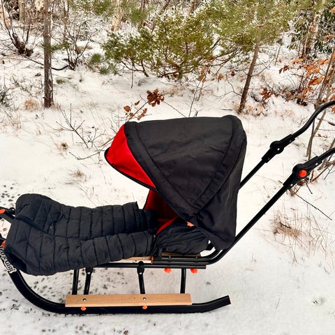 Akebrett med vognpose i blå farge. Pulk med hvit ramme og meier, samt små hjul bak for enklere håndtering på bar bakke. Sete med polstring og sele for barnet. Avtakbar eller justerbar kalesje som skjermer mot vær og vind. Vognposen har innside i mykt, lys fôr for ekstra varme. Egnet til transport av barn på snø, for eksempel på tur eller til og fra barnehage i vinterhalvåret.