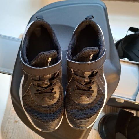 Nike løpesko for barn/unisex i størrelse 37. Skoene er i svart med hvit såle